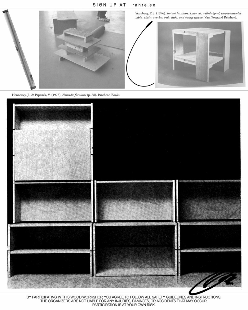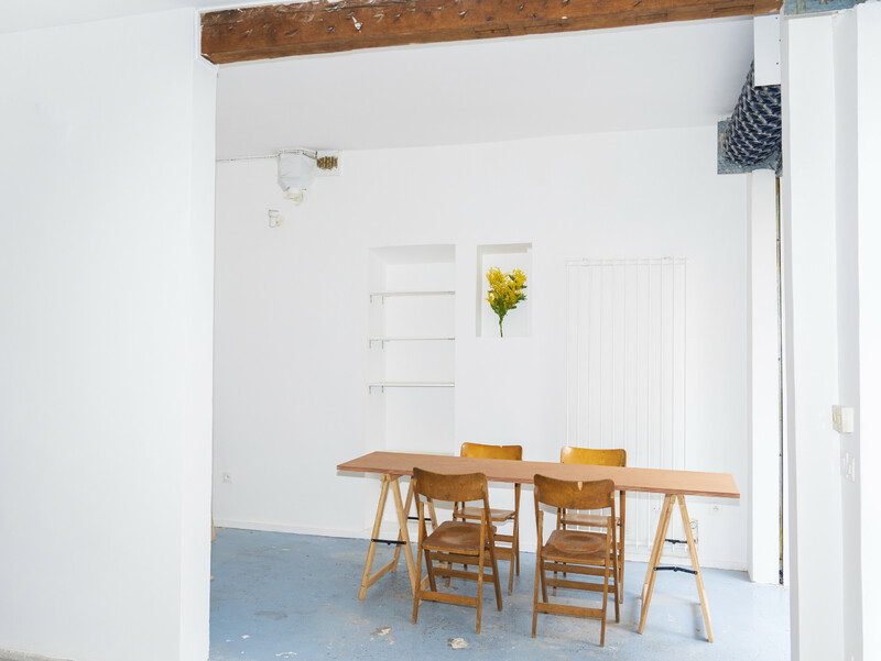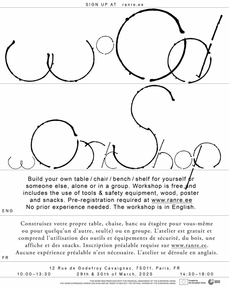 Le week-end du 29 mars, Ran et Jim transforment le local en atelier de menuiserie éphémère. Tout au long de la semaine passée, du bois abandonné est récupéré dans les rues de Paris. Les participant•es à l’atelier construisent avec ces matériaux, sans expérience en construction nécessaire—les méthodes intuitives sont encouragées.